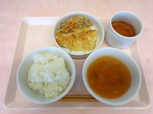 ごはん・カレイのパン粉焼き・キャベツのゆかり和え・大根のみそ汁