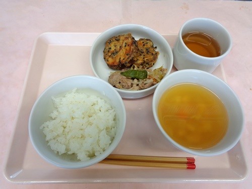 ごはん・豚肉の生姜焼き・さつま芋の天ぷら・キャベツのみそ汁
