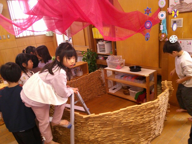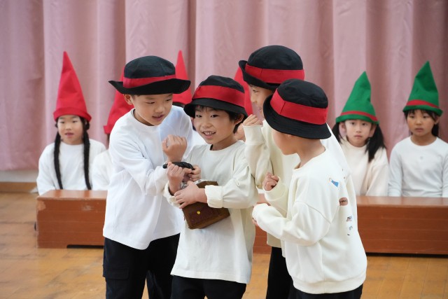 「ホッツェンプロッツがコーヒー挽きを持って行ってしまうところは、どうしたらいいかな?」「ツワッケルマンがブクブクって沈んでいくところは、どうしよう?」自分の出番だけでなく、皆で「こうしたら どう?」「他の人は、どう思う?」と考えを伝えあいながら、少しずつ 作り進めていきました。