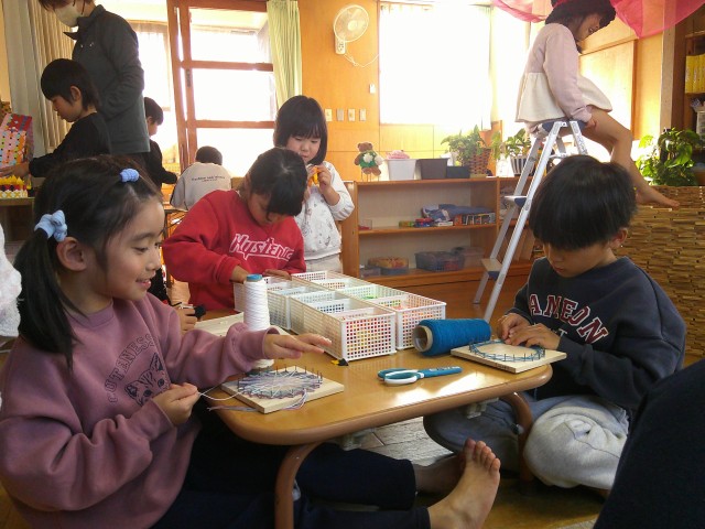 にじのおうち(3~5歳児)は、『まいごのまめのつる』の絵本に見入ってくれていて、「メグばあさん」や「マグばあさん」のおうちを積み木で積みました。収穫した豆で、豆スープを作って、楽しんでいます。豆のツルは、皆で 指編みして、長~いツルにしましたよ!