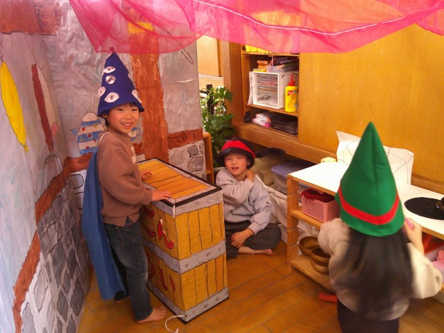 童話『大どろぼうホッツェンプロッツ』が好きで、カプラで「大魔法使いツワッケルマンの城」を建て、その世界観で遊びこんでいた らいおんさん。「ホッツェンプロッツの劇がしたい!」という声が上がるようになり、劇作りが始まりました。