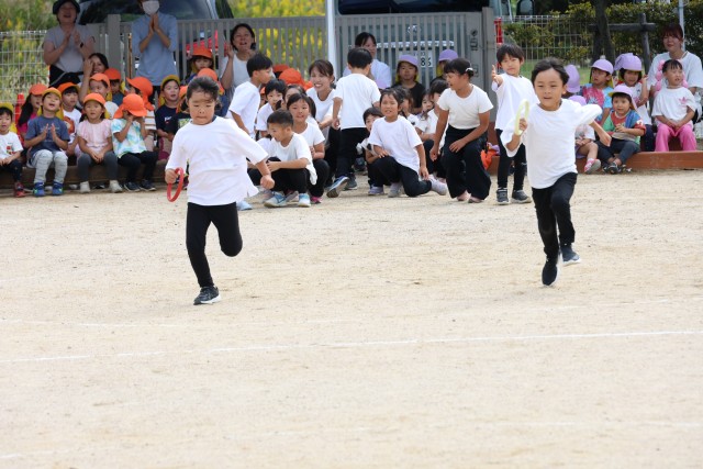 年長さんは、バトンリレーをしました。チームで作戦会議を立てて、当日を迎えました。力いっぱい駆け抜ける姿は、とても かっこよかったです。
