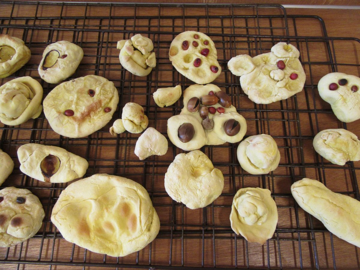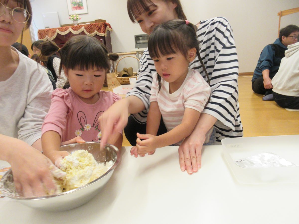 先日、たんぽぽのおうち(2歳児)では、『親子であそぼう会』が開催されました。絵本「ぱんやのくまさん」のお話が大好きで、当日はくまさんがぱんの粉やお水などの材料をとどけてくれて、おとうさんおかあさんといっしょにパン作りをしました。粉をこねたり、形を作ったりしながら、パンが出来上がり、オーブンで焼きました。とってもかわいいパンがいっぱいできたので、お部屋にパン屋さんがオープンするみたいですよ♪